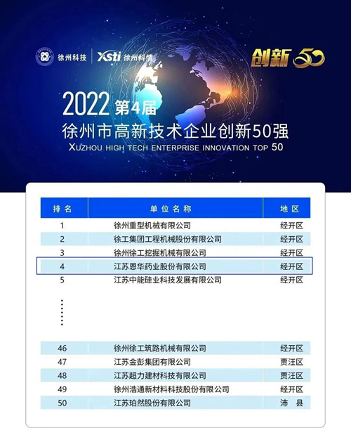 “恩华”品牌荣获徐州市十大工业品牌称号